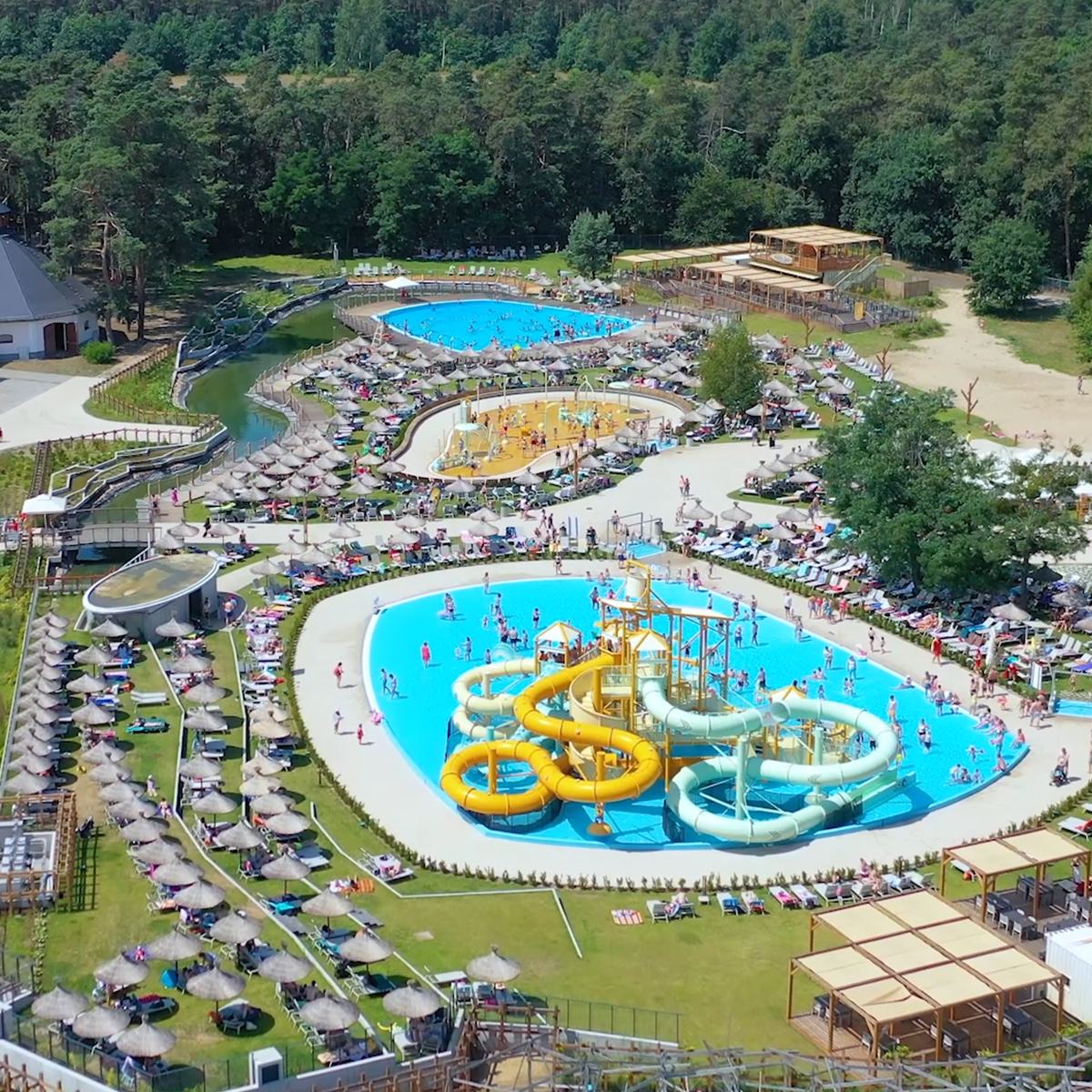 • Park Wodny - do dyspozycji 5 zjeżdżalni, strefa basenowa poziomowana do głębokości maksymalnej 2 m, spray park (rekreacyjna strefa z niewielką ilością wody z interaktywnymi zabawkami i armatkami wodnymi), oraz strefa wypoczynkowa z leżakami i parasolami,