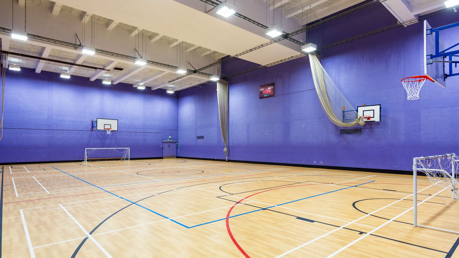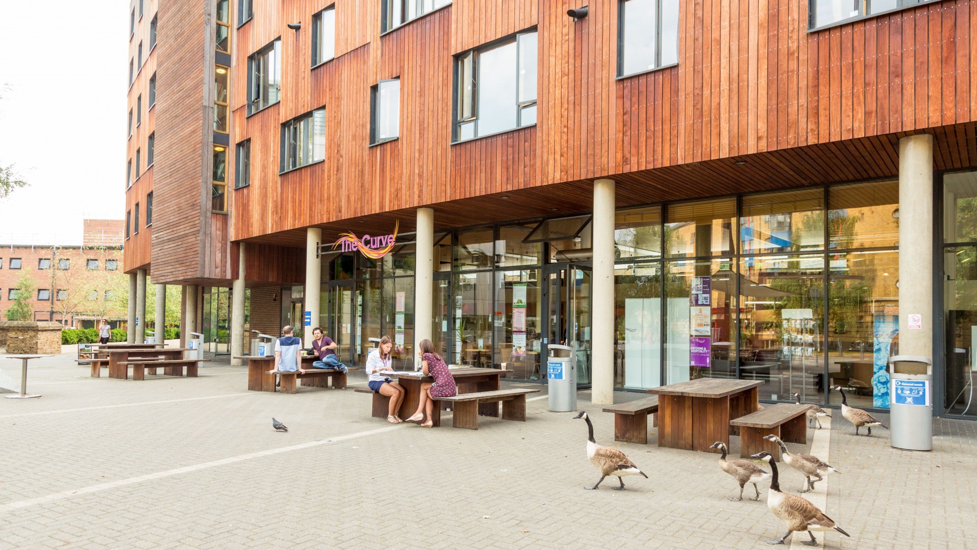 Na terenie kampusu znajdują się sklepiki, kawiarnie oraz duża hala sportowa.